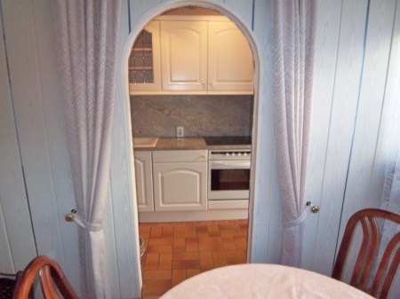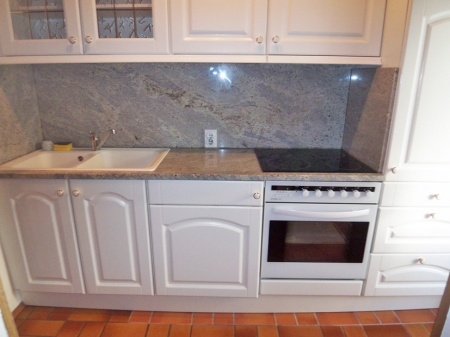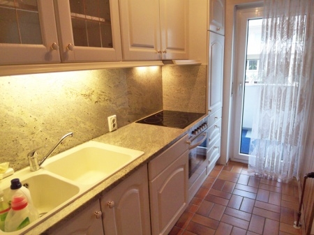 Die Küche ist mit einer weißen Einbauküche ausgestattet. Sie beinhaltet einen Backofen mit Ceranfeld, Spüle mit Doppelbecken, Kühlschrank, Ober.- und Unterschränken sowie eine Einbauwaschmaschine.