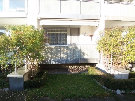 Aussicht in den idyllisch bepflanzten Hinterhof. Von hier aus gelangt man auf den 2. Balkon (Südbalkon), der ganztags Sonne bietet. Hier wurde eine Markise angebracht.