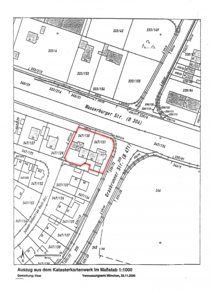 Beide Grundstücke haben bewohnte Häuser. Das eine Haus bewohnt ein Eigentümer selbst. Das andere Grundstück sind 8 Mieter. Die Mietverträge sind sehr gut kündbar, da es sich um Überlassungsverträge, die immer auf 1 Jahr befristet sind, handelt. Lage: Dieses Grundstück liegt in zentraler Lage am östlichen Ortsrand von Haar. Die nähere Umgebung ist geprägt von reiner Wohnbebauung, überwiegend Eigenheimen und Wohnanlagen.