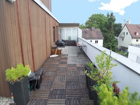 Somit könnte der neue Eigentümer in Zukunft (beide Wohnungen vermietet) aus den beiden 2 Zimmerwohnungen eine 4 Zimmer Wohnung gestalten, die eine fast umlaufende Dachterrasse von Gesamtfläche ca. 140 m² bietet. Dies Bedarf keinem großen Umbauaufwand.