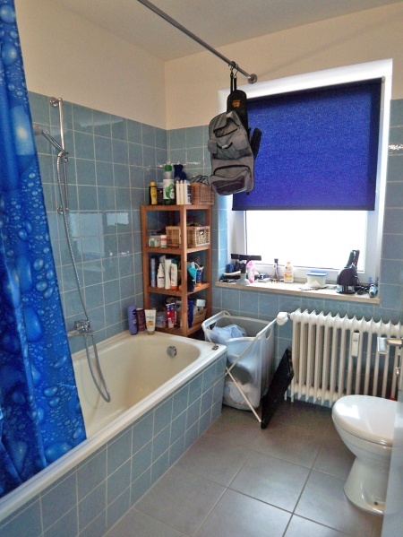 Das Badezimmer ist mit Badewanne, Waschbecken sowie Toilette ausgestattet. Gefliest dem Baujahr entsprechend.