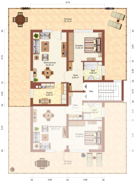 | Balkon/Terrasse Fläche | 75 m² | Befeuerung | Gas |