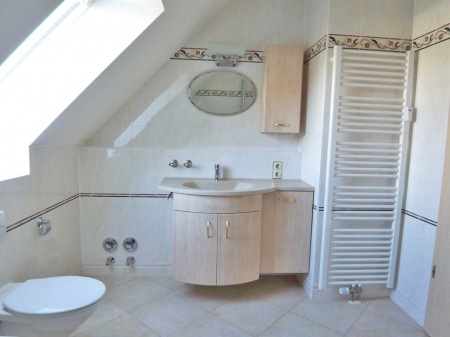 Das Badezimmer mit Tageslicht wurde mit naturfarbenen Versace Bodenfliesen sowie Villeroy & Boch Wandfliesen hochwertig ausgestattet. Es bietet Badewanne und separate Dusche! Ein eingebauter Waschtisch sowie ein Handtuchheizkörper runden das sehr gut ausgestattete Badezimmer ab.