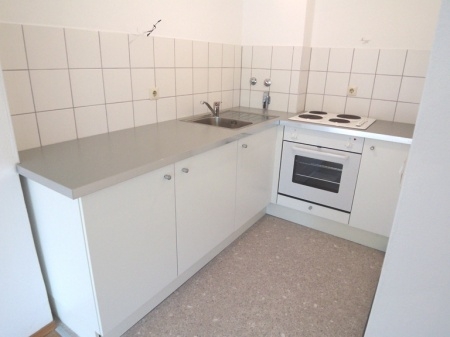 In der Kochnische gibt es einen Herd, Backofen und Kühlschrank sowie Oberschränke, Farbe der Küche ist Weiß.