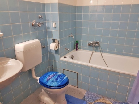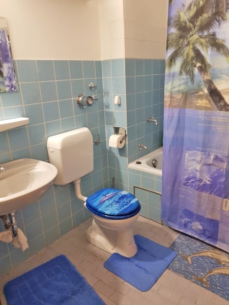 Vom Flur aus gelangt man in das Badezimmer (mit Badewanne, Waschbecken und Toilette, Wandfliese hellblau-Bodenfliese hellgrau) sowie in das großzügig geschnittene Wohn.-Schlafzimmer.