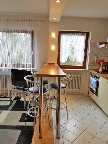 Des Weiteren hat dieser Raum eine integrierte Einbauküche mit Esstheke, die durch Deckenspots ein besonderes Ambiente hervorruft.