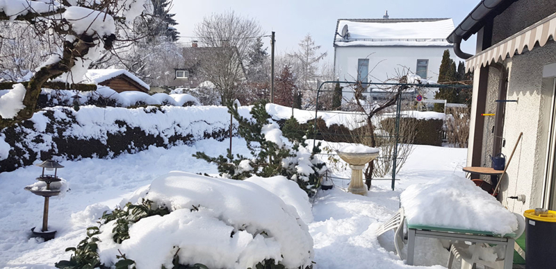 Die Wohnung im Erdgeschoss hat zusätzlich eine schön eingewachsene Süd-Terrasse mit Zugang zum Garten. Im September 2017 wurde hier eine Markise angebracht.