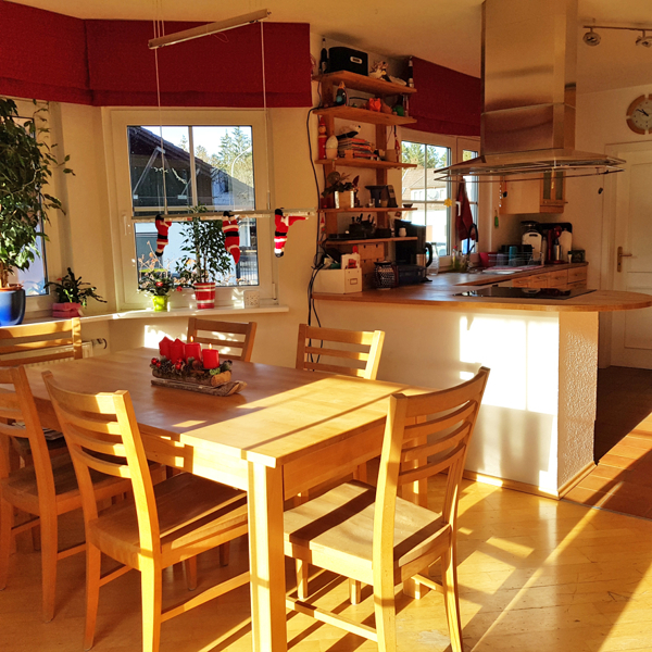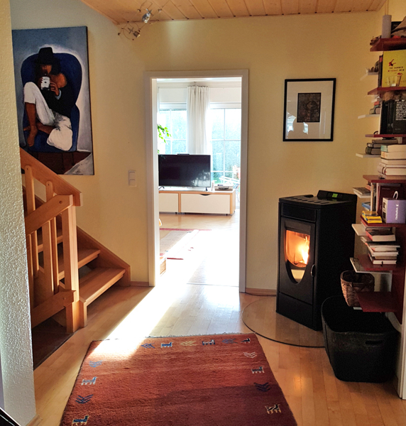 Im Flur befindet sich ein Ofen, der nicht nur Wohnlichkeit und Gemütlichkeit ausstrahlt, sondern auch wunderbare Wärme im Haus verteilt. Der Ofen wird mit Pellets befeuert.