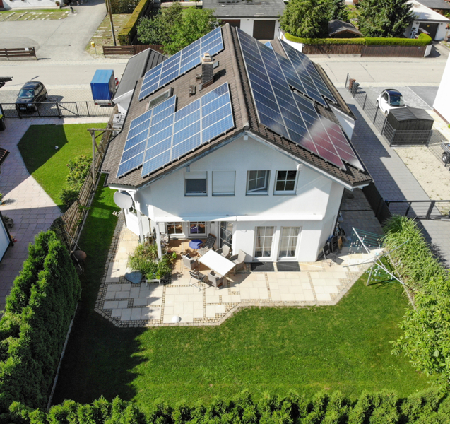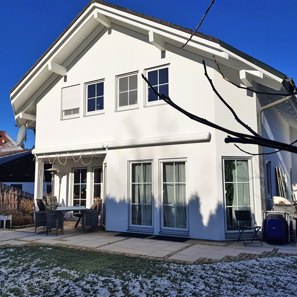 Das Haus wurde von der Firma Haas in Holzständerbauweise gebaut.