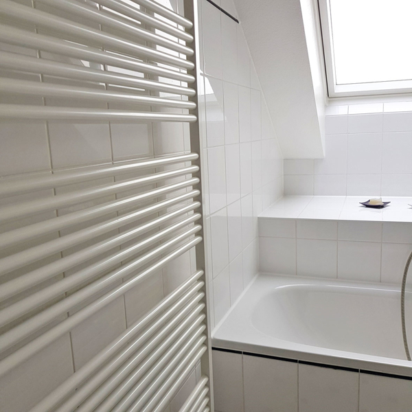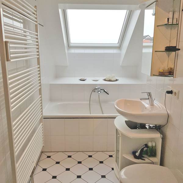 Das Tageslicht helle Badezimmer hat Weiße Wandfliesen und die Bodenfliese ist Weiß mit kleinen Schwarzen Fliesen. Es beinhaltet Badewanne, Waschtisch, WC sowie einen Handtuchheizkörper. Zudem gibt es einen Stellplatz für die Waschmaschine sowie den Trockner. Somit kein lästiges Waschen im KG!