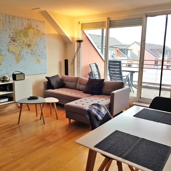Von hier aus gelangt man in das helle Wohnzimmer mit angrenzender Dachterrasse, die überdacht ist.