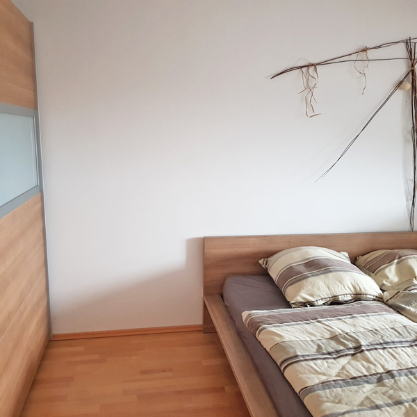 Das Schlafzimmer ist geräumig und bietet Platz für ein großes Doppelbett, Schrankwand sowie einen Arbeitsbereich.