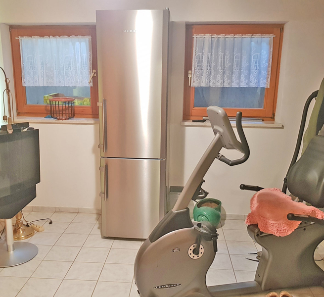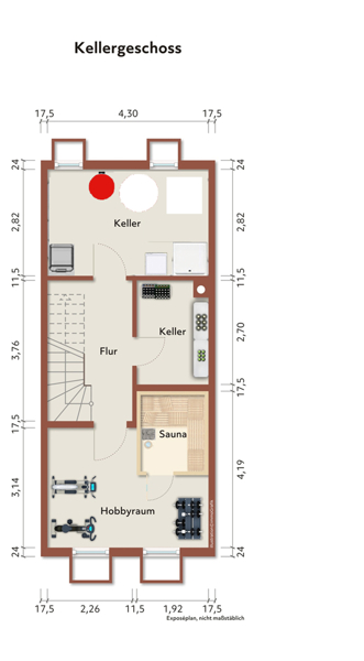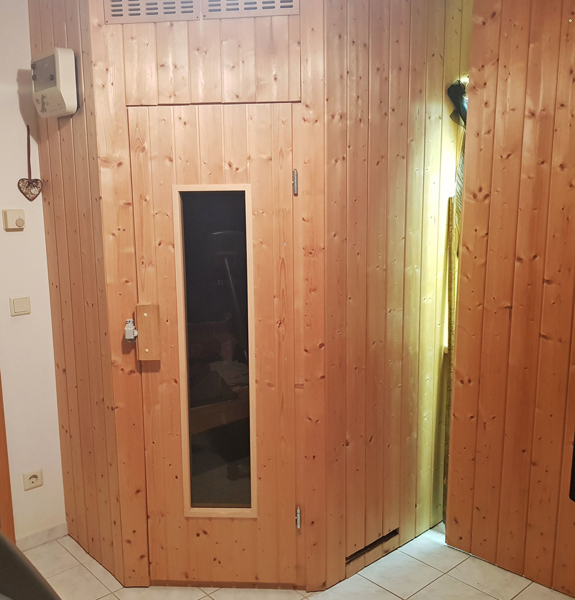 Hobbyraum mit Sauna, Abstellraum sowie der Heizungs- und Waschraum mit einer weiteren Dusche. Zusätzliche Abstellmöglichkeit befindet sich unter der Treppe.