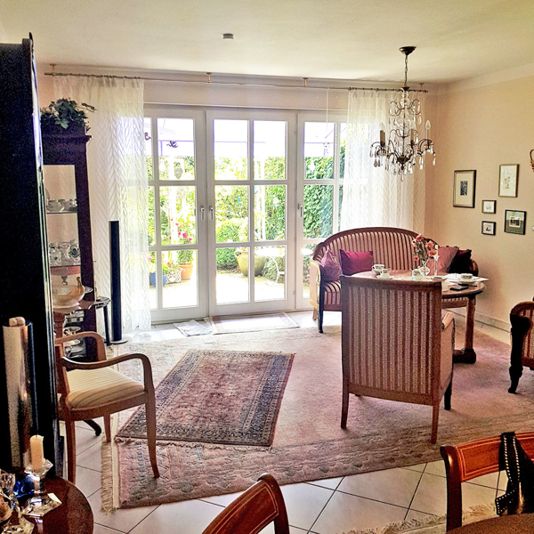 Flur, Gäste-Toilette, separate Küche mit Einbauten (elektronische Geräte teils erneuert), Wohnzimmer mit Austritt auf die Terrasse und den wunderschön angelegten Garten mit kleinem Gartenteich, Pavillon und Zugang zum Gemeinschaftsgarten.