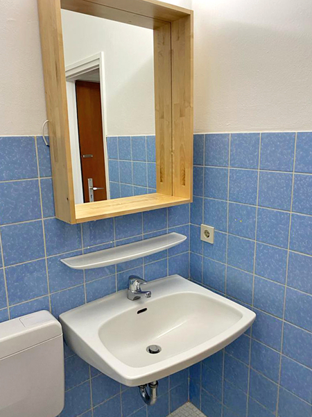 Das Badezimmer bietet eine Badewanne, Waschtisch, WC und Heizkörper. Die Wandfliesen sind hellblau und die Bodenfliesen Weiß. Sonstige Angaben: Das Apartment ist seit dem 01.09.2020 an sehr angenehme Mieter vermietet.