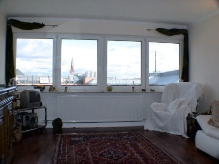 Im ca. 24 m² grossem Wohn-Schlafzimmer ist ein dunkelbrauner Hartholzparkettboden. Eine Fensterreihe lassen viel Licht in diesen Raum und bieten eine wunderschöne Aussicht über die Dächer von Haidhausen, das Gasteig sowie das Hotel Hilton.
