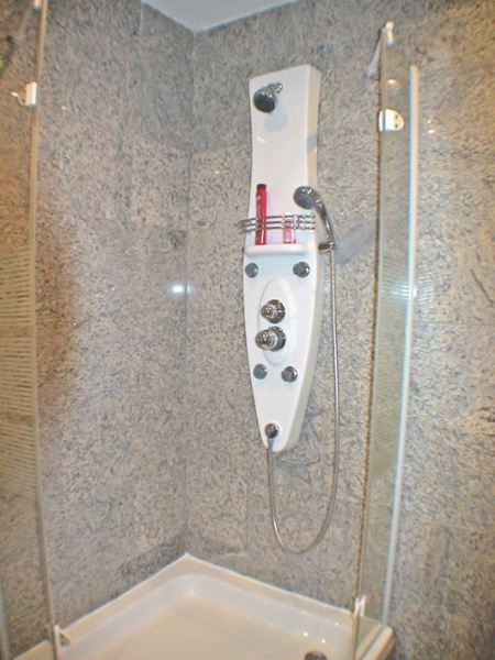Das Badezimmer ist durch den grauen Marmor an Wand und Boden sowie der verglasten Eckdusche, den integrierten Spots in der Decke, sehr elegant und modern.