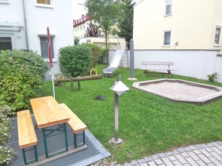 Ein schön angelgter Innenhofbereich mit einem kleinen Spielplatz und Brunnen sorgen für ein angenehmes Ambiente.