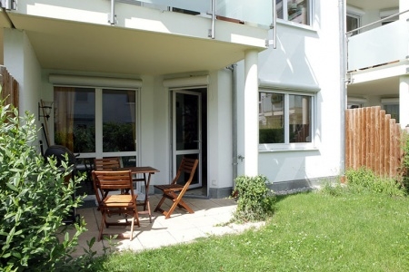 Ausstattung: Das Wohnzimmer sowie das Schlafzimmer sind mit Laminat ausgestattet und blicken Richtung Innenhof. Vom Wohnzimmer aus gelangt man auf die sonnige Südterrasse mit kleinem Garten.