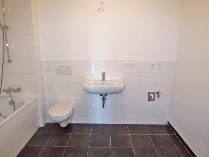 • Bad mit Badewanne, Wandfliese Weiß und Bodenfliese Anthrazit