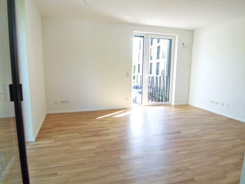 Über den Flur gelangt man in alle weiteren Räume. Das Wohnzimmer mit Küchenbereich lässt sich ideal möblieren. Eine hochwertige Einbauküche wird den Mietern gestellt. Von hier aus erreicht man über zwei Zugänge die Loggia mit Glasschiebeelementen. Durch den alten Baumbestand bietet die Loggia einen sehr schönen Ausblick. Hier kann man seinen Tag in der Abendsonne ausklingen lassen.