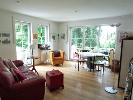 Die angebotene Eckwohnung ist mit vielen Fenstern und viel Licht versehen. Vom Wohnzimmer aus gelangt man auf den Westbalkon, mit Blick in die Nachbargärten, sowie auf den Südbalkon.