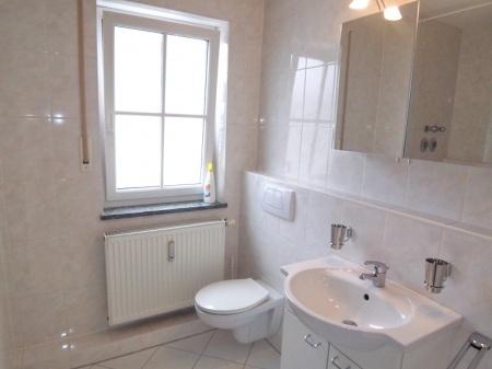 Das Tageslicht erhellte Badezimmer ist mit einer Badewanne, Waschbecken und Toilette, ausgestattet.
