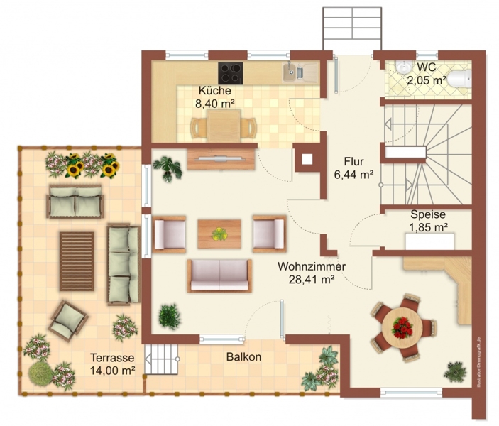 Im Erdgeschoss befindet sich das Wohnzimmer ca. 30 m² Wfl. von dem aus man über einen Balkon auf die großzügige Terrasse gelangt. Der Bodenbelag ist im Wohnzimmer Parkett und im Flur sowie in der Küche und in der Gästetoilette weiss gefliest.