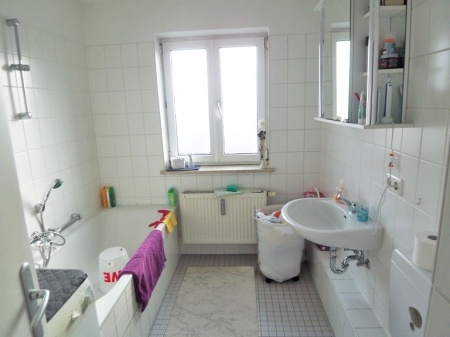 Das weiß geflieste Badezimmer ist durch das Fenster Tageslicht erhellt und bietet Platz und Anschluss für die Waschmaschine. Sonstige Angaben: Alle Angaben sind ohne Gewähr und basieren ausschließlich auf Informationen, die uns vom Auftraggeber zur Verfügung gestellt wurden. Wir übernehmen keine Gewähr für die Vollständigkeit, Richtigkeit und Aktualität dieser Angaben. Die Provision in Höhe von 2 Monatsmieten (kalt) zzgl. 19% Mehrwertsteuer ist mit dem Zustandekommen des Mietvertrages verdient und fällig. Irrtum und Zwischenvermietung vorbehalten.