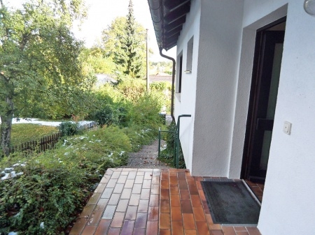 Da das Haus auf einem kleinen Hang steht sind es ein paar Treppen zum Wohnungseingang.