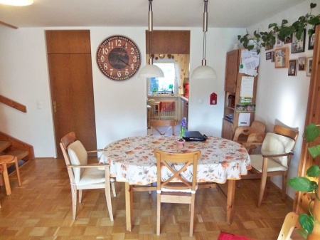 Der Wohn.-Essbereich ist mit Parkett ausgestattet. Von hier aus betritt man die separate Küche mit vorhandener Einbauküche und einem Bistrotisch und Hockern.