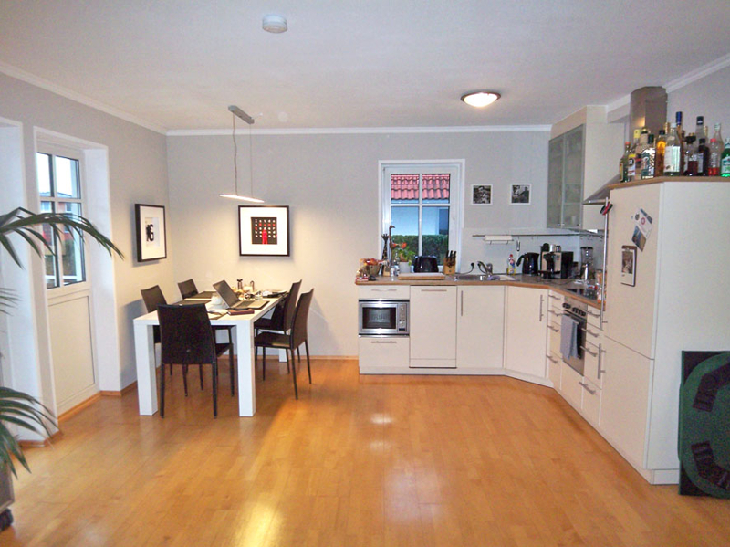 Vom Flur aus gelangt man entweder auf der einen Seite zum grosszügig geschnittenen Wohnraum mit offener Einbauküche sowie auf den ersten Balkon.
