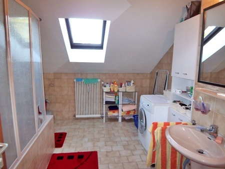Das sehr großzügige tageslichterhellte Badezimmer (mit Badewanne) ist geräumig und bietet Platz für eine Waschmaschine. Sonstige Angaben: Zur Wohnung gehört ein Kellerraum sowie ein TG-Stellplatz (monatlich 45 Euro).