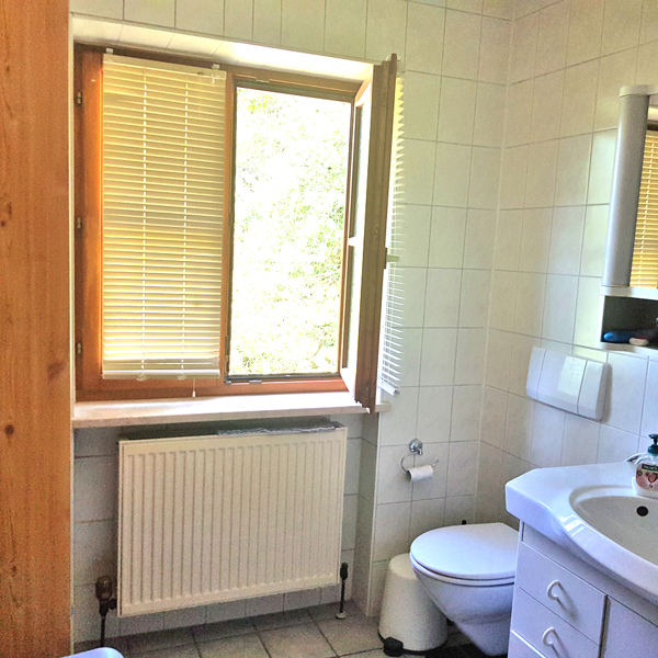 Das Badezimmer ist hell gefliest und mit einer sehr geräumigen Dusche mit Sitzmöglichkeit ausgestattet. Durch das grosse Fenster ist das Badezimmer Tageslicht erhellt.