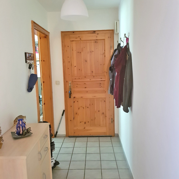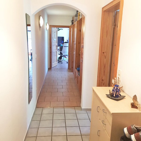 Beim Betreten der Wohnung gelangt man in den Flur mit Garderobe und Einbauschränken. Alle Zimmer sind vom Flur aus zu Betreten und haben Blick ins Grüne.