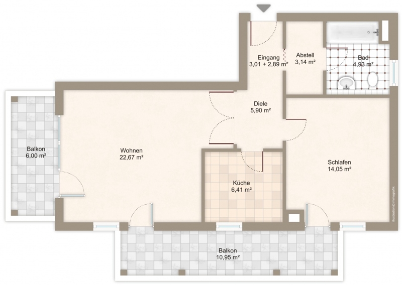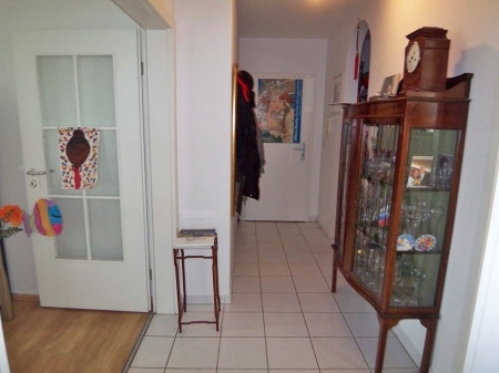Flur, Garderobe, Badezimmer und Küche sind Weiß gefliest.