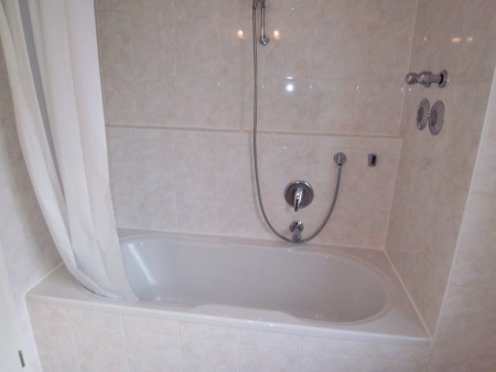 Das Tageslicht erhellte Badezimmer ist mit einer Badewanne, Waschbecken und Toilette, ausgestattet.