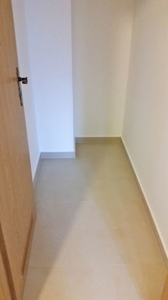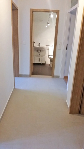 Im Flur + Küche + Abstellkammer wurde ein naturfarbener Fliesenboden verlegt