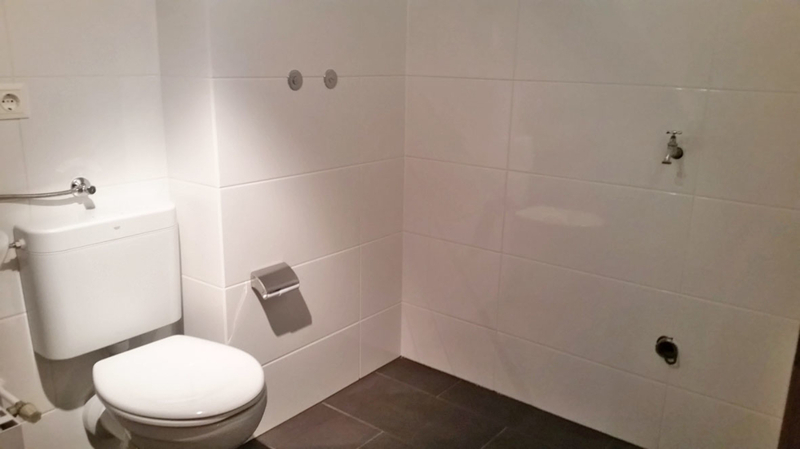 Das Badezimmer wurde mit anthrazitfarbener Bodenfliesen und weißer Wandfliese, Waschbecken + Badewanne + Toilette und Anschluss für Waschmaschine, ausgestattet.