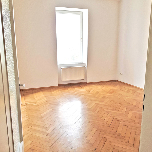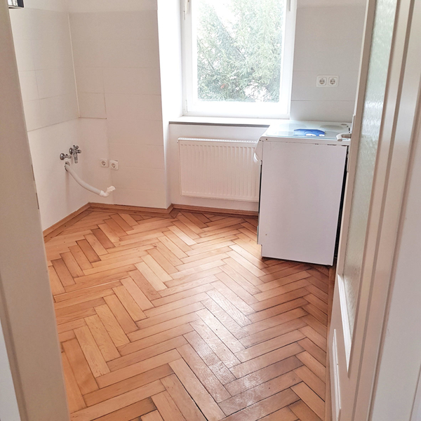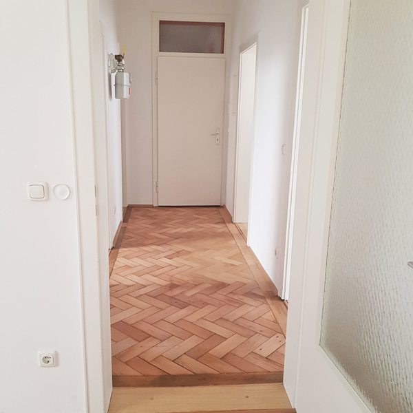 Die komplette Wohnung hat Parkettböden (Fischgrätparkett) außer dem Badezimmer.