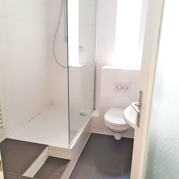 Dies wurde vor ein paar Jahren erneuert. Ausgestattet mit modernen Grauen Bodenfliesen, Weißen Wandfliesen, auf einem Podest eine bodengleiche Dusche mit Glaskabine, Stellplatz und Anschluss für die Waschmaschine sowie Waschtisch und Toilette!