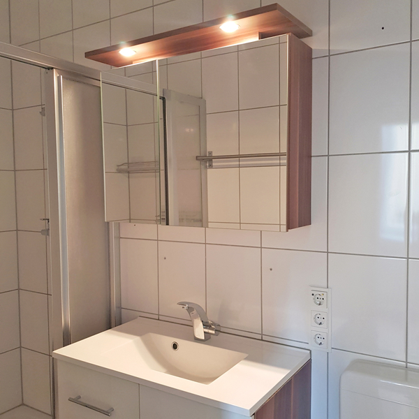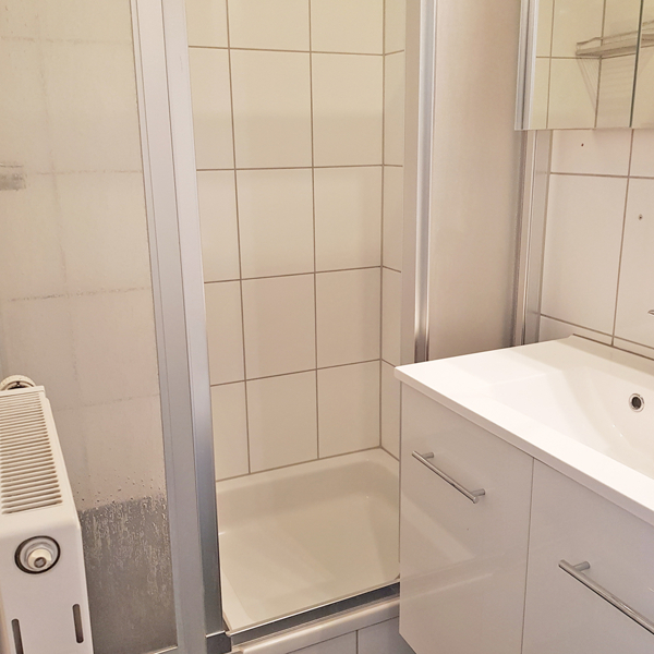 Das modern geflieste Badezimmer (Boden Grau, Wand Weiß) ist mit einer Dusche, Waschtisch mit Spiegelschrank, WC und Heizkörper, ausgestattet.
