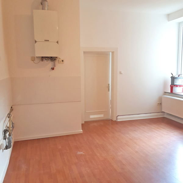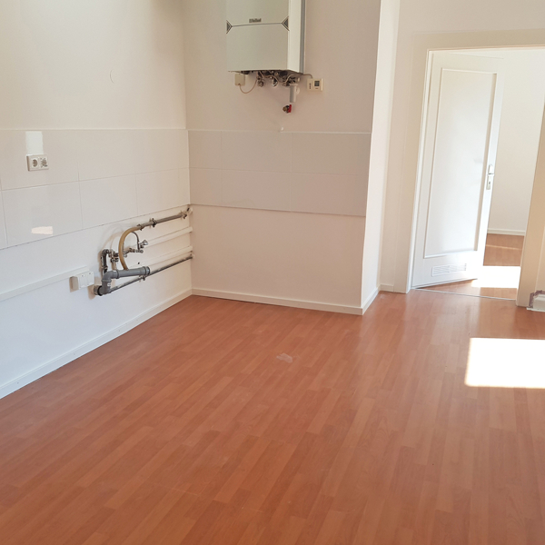 Offen gehalten in dem Raum befinden sich die Anschlüsse für eine Einbauküche.