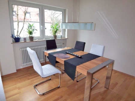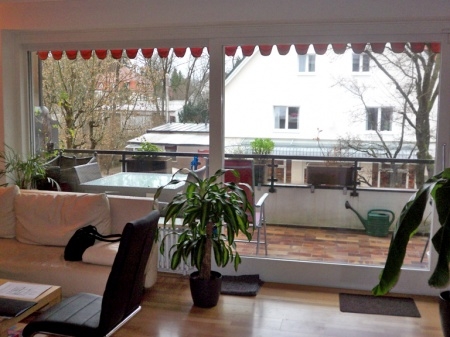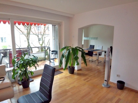 Das Wohnzimmer und angrenzendem Esszimmer oder Büro sind mit Buchenparkett ausgestattet. Eine sehr grosse Fensterfont mit Austritt auf den geräumigen Westbalkon lassen viel Licht in die Wohnung. Eine elektrische Jalousie spendet im Hochsommer dem sehr sonnigen Balkon Schatten.