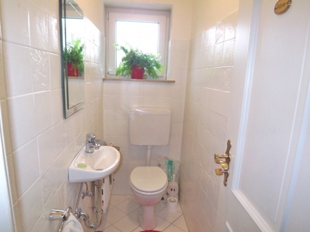 Das weisse Badezimmer und die weisse separate Toilette sind Tageslicht erhellt und wurden vor kurzer Zeit neu gefliest. Das Badezimmer bietet eine Badewanne und genügend Platz für eine Waschmaschine.