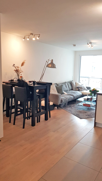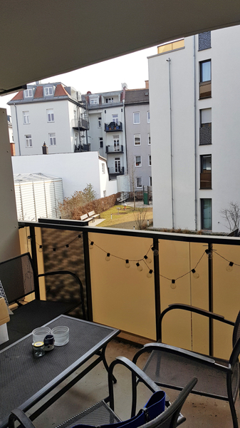 Das Wohnzimmer lässt sich sehr gut möblieren und der überdachte Balkon lädt zusätzlich zum Entspannen, auch wenn es mal ein bisschen regnet, ein.