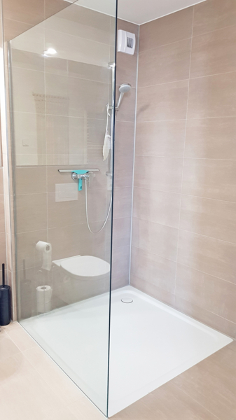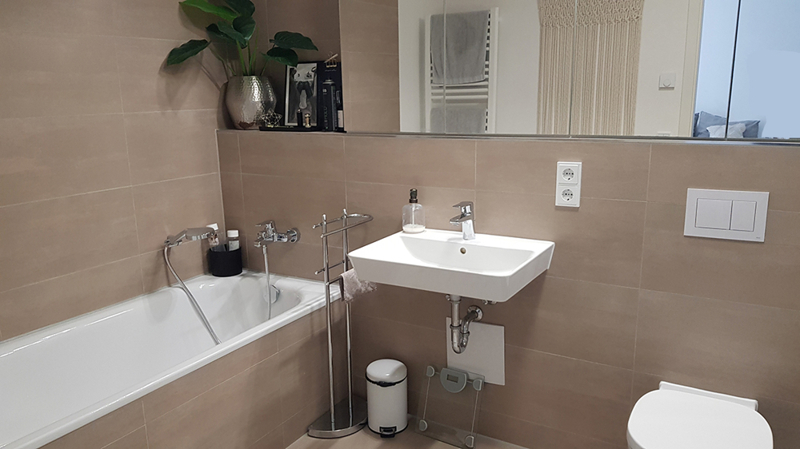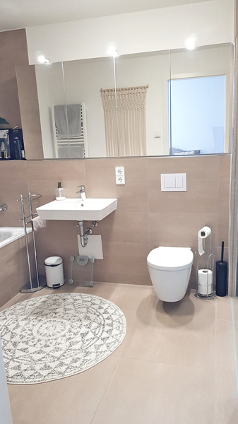 Das fast 9 m² große Badezimmer ist vom Design gleich dem „Gäste“ Badezimmer.