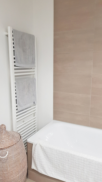Mit großen Boden- und Wandfliesen, Badewanne und Handtuchheizkörper, Waschtisch und übergroßer bodengleicher Dusche sowie WC.