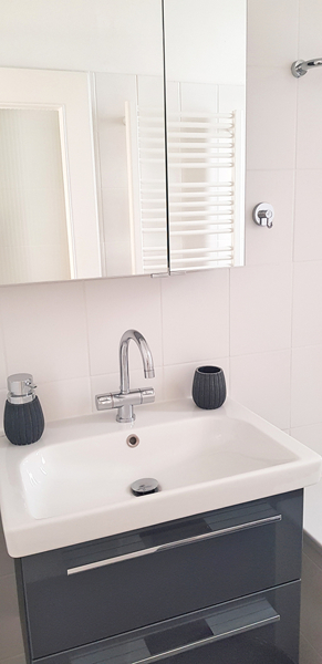 Diese sind mit modernen Grauen Bodenfliesen ausgestattet. Das Badezimmer hat ein kleines Fenster, Badewanne, Waschtisch mit Schubfächern und Toilette!