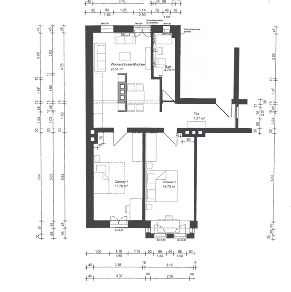 - zwei fast gleichgroße Zimmer